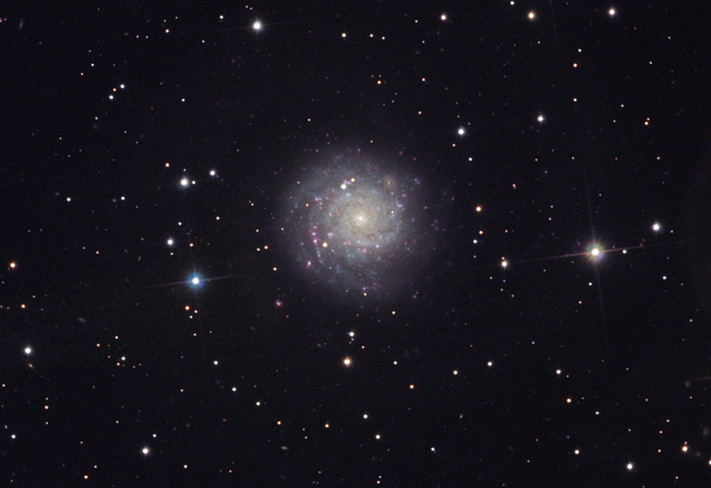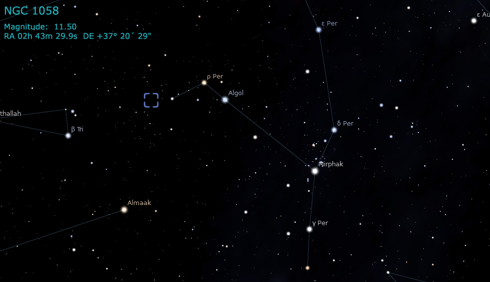 NGC 1058 is a Seyfert Type 2 galaxy in the Perseus constellation. It is approximately 27.4 million light years from Earth and has an apparent magnitude of 11.82. It is receding from Earth at 518 kilometers per second.