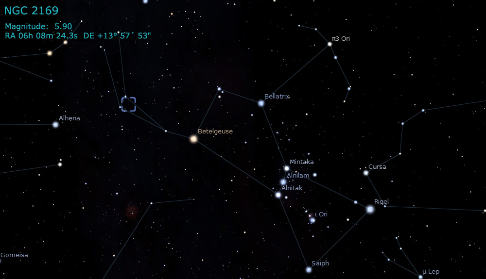 NGC 2169, is an open cluster in the Orion constellation. NGC 2169 is at a distance of about 3,600 light years away from Earth. It is nicknamed "The '37' Cluster" due to its striking resemblance to the numerals "37."