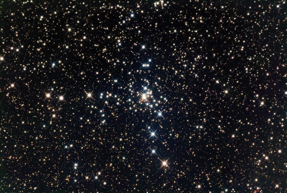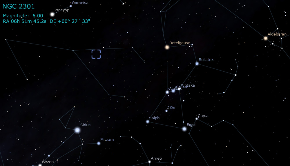 NGC 2301 is an open cluster made up of 80 stars located in the constellation Monoceros. The latest age estimate is 210 million years and a recent distance estimate is 1,650 light years.