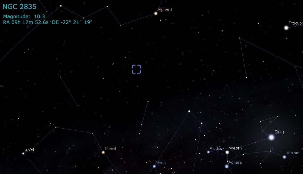 NGC 2835 is a magnitude 10.3 face-on barred spiral galaxy located 41 million light-years away in the constellation Hydra.