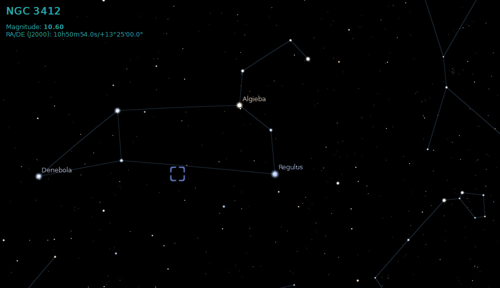 NGC 3412 is a barred spiral galaxy located in the constellation of Leo and is a member of the M96 Group of galaxies, which is a sub group of the Leo I Group.