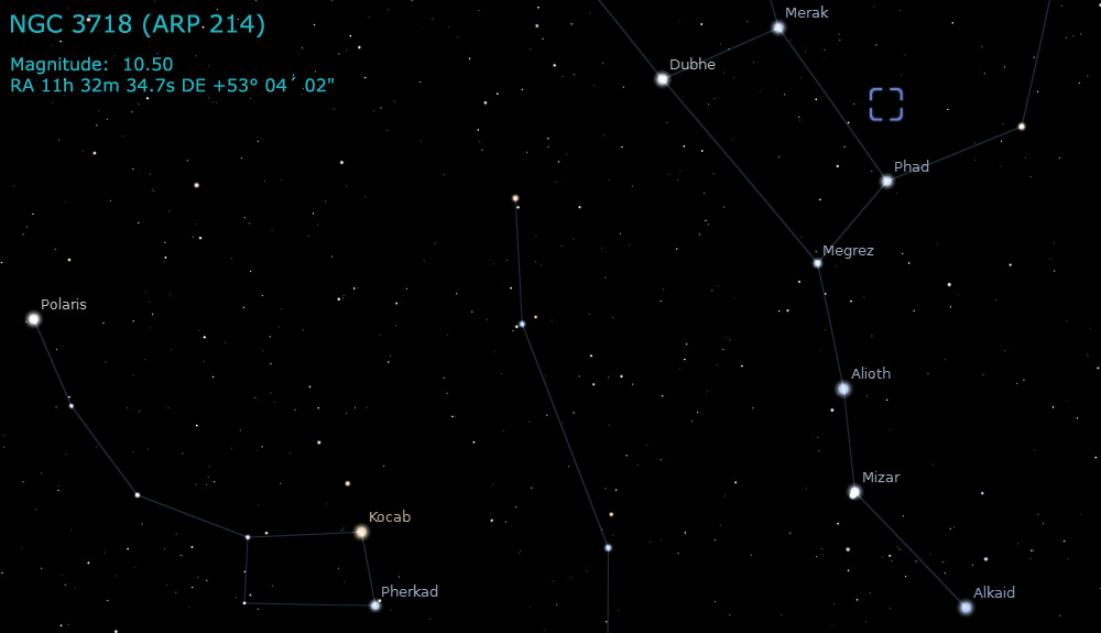 NGC 3718 is a highly disturbed galaxy in Ursa Major. The galaxy forms an interacting pair with NGC 3729. The distance to NGC 3718 is roughly 52 Million Light Years.