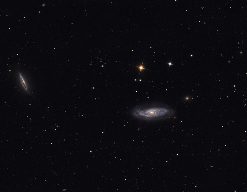NGC 5899 is a barred spiral galaxy in the constellation Bootes. It forms a pair with NGC 5900, shown here on the left. They both show signs of gravitational interaction. They are seperated by roughly 10 million light years.