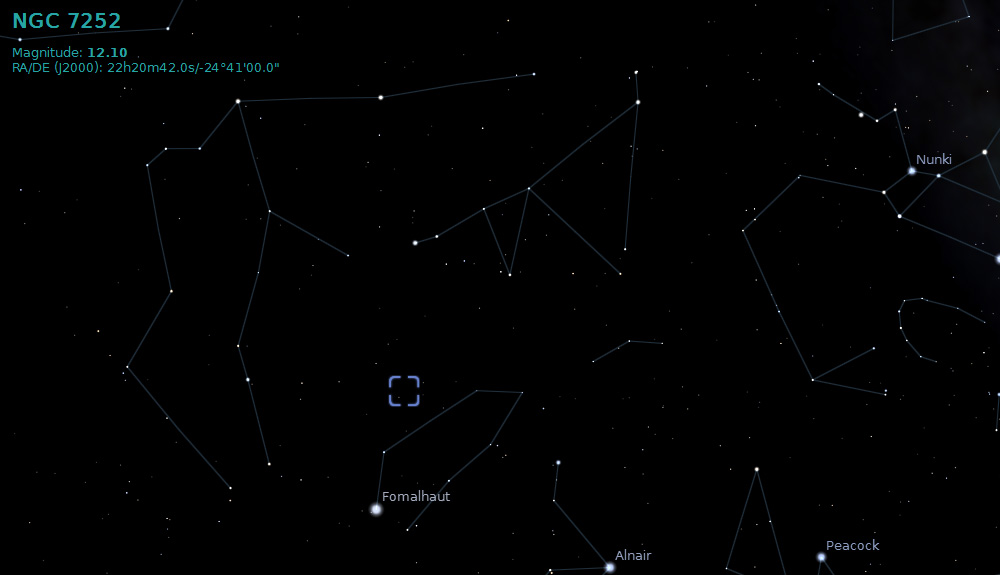 NGC 7252 is a peculiar galaxy resulting from an interaction between two galaxies that started a billion years ago. It is located 220 million light years away in the constellation Aquarius.