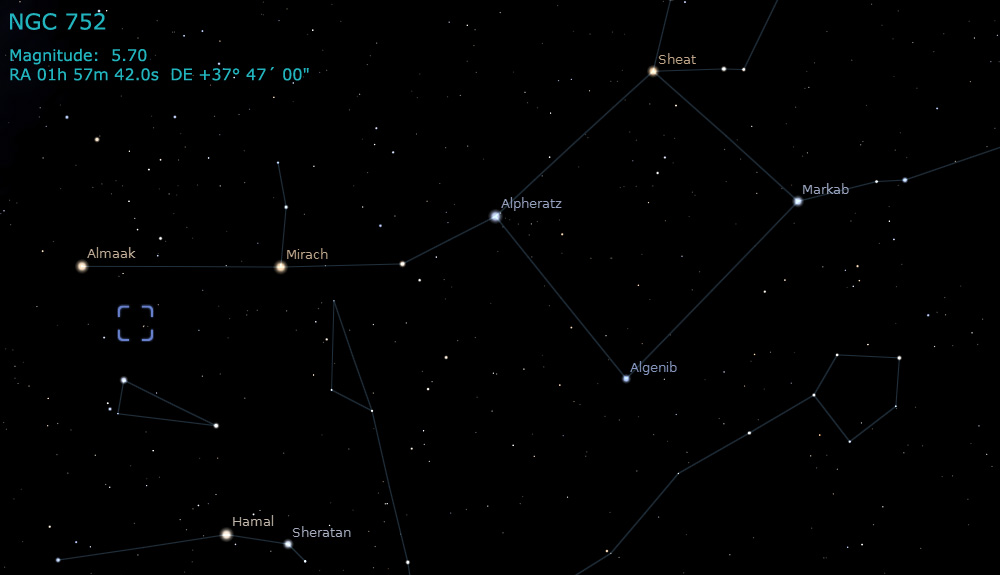 The catalog references for this cluster is NGC 752. It is located in the constellation of Andromeda. The cluster is one of the Milky Way's older open clusters. It is a distance of approximately 1,300 light years from Earth.