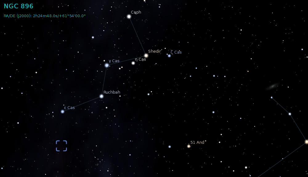 NGC 896 is a region of faint hydrogen alpha emission that is situated in the northwestern corner of IC1805