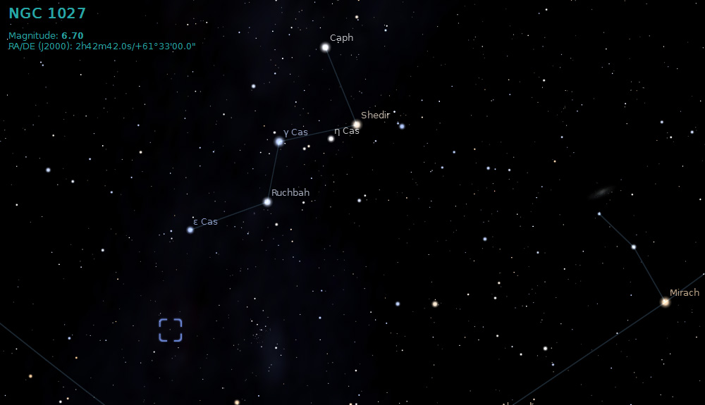 Located in the constellation of Cassiopeia NGC 1027 is visually just outside of the emission nebula know as the "Heart Nebula", but at a distance of 3,300 light years it is about half way between Earth and the nebula.