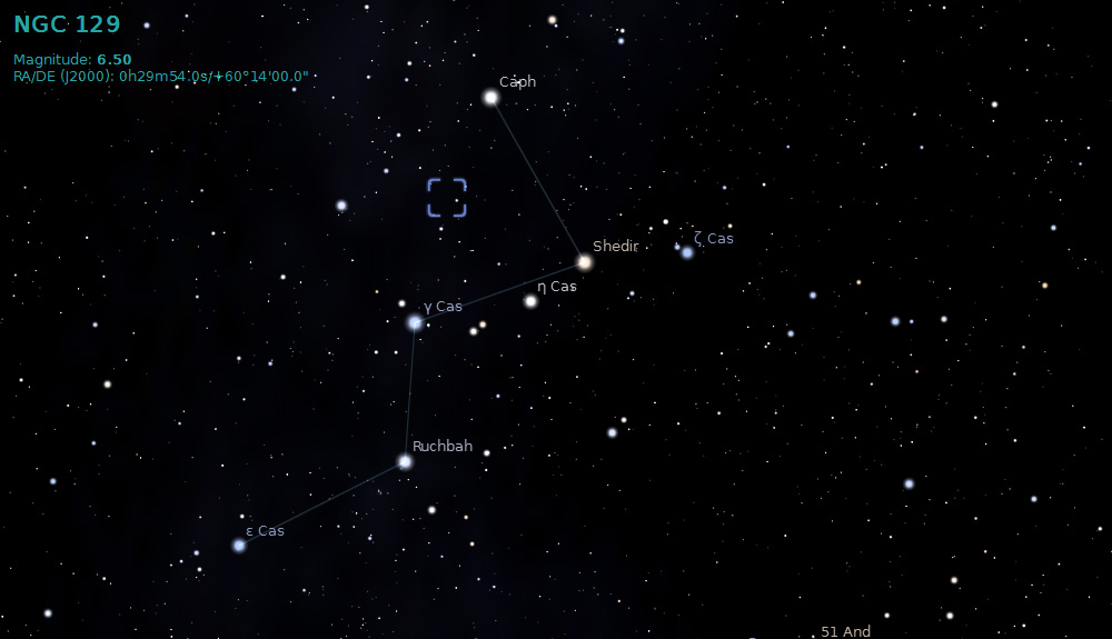 NGC 129 is an open cluster in the constellation of Cassiopeia. It is a small cluster formed by about 35 stars. NGC 129 is about 9,900 light years distant from Earth.