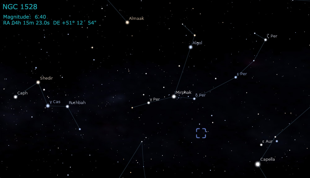 NGC 1528 is an open cluster located in the constellation of Perseus. The estimated distance from Earth is 2,531 light years. NGC 1528 has an angular diameter of 18 arc minutes and a brightness of 6.40 mag.