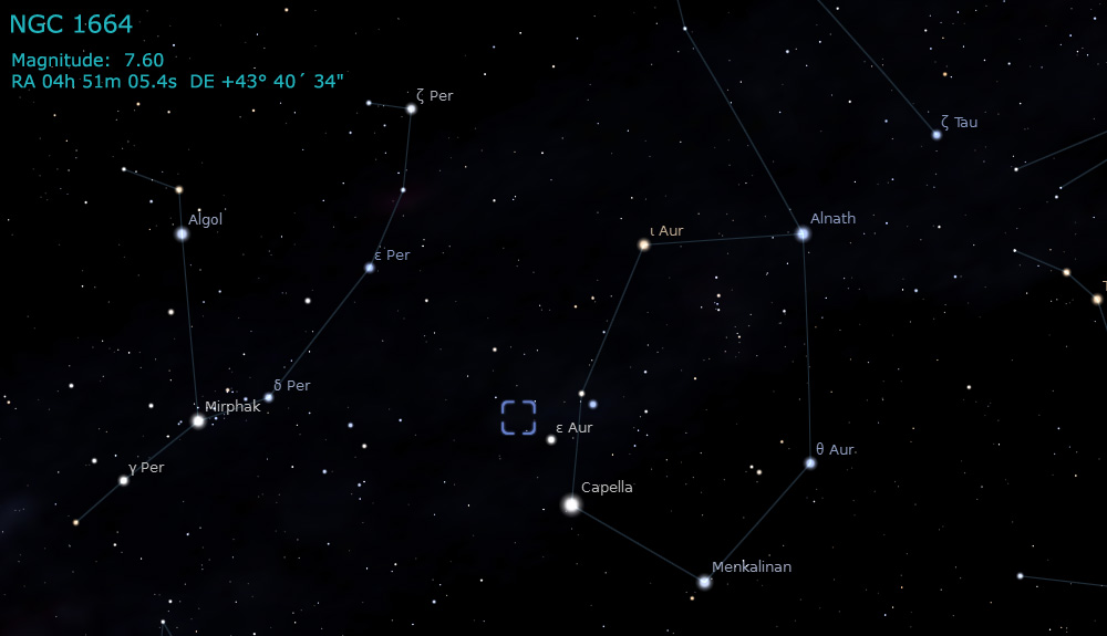 NGC 1664 is an open cluster in the constellation of Auriga. It contains fewer than 50 stars and lies at a distance of 3909 light-years.