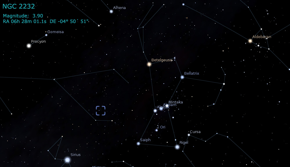 NGC2232 is a bright open cluster in Monoceros containing roughly 22 stars. The brightest star near the center of the image is 10 Monocerotis. Distance to NGC 2232 is estimated at 1350 light years.