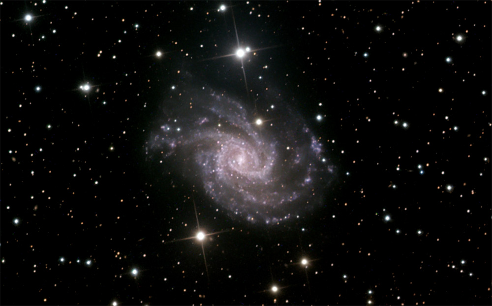 NGC 2835 is a magnitude 10.3 face-on barred spiral galaxy located 41 million light-years away in the constellation Hydra.
