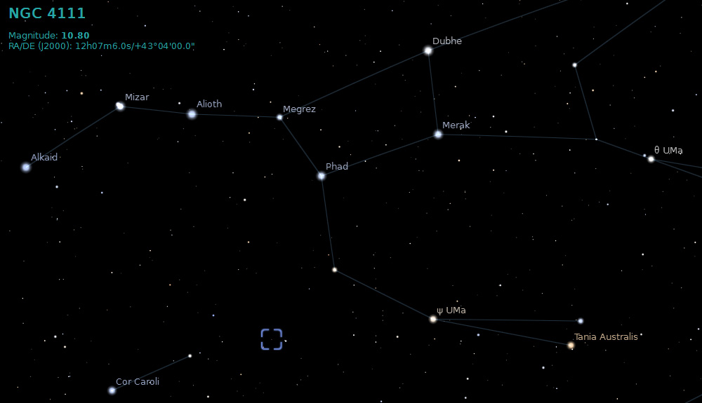 NGC 4111 is a spiral galaxy located roughly 50 million light-years away in the constellation of Canes Venatici. It is part of the Ursa Major South Group of galaxies, which is comprised of at least 32 large galaxies.
