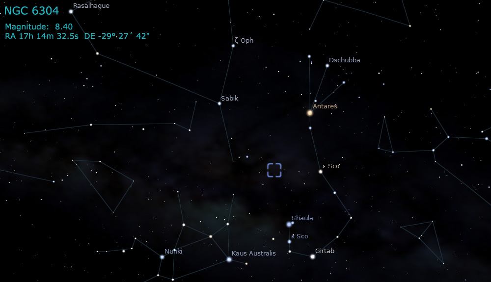 NGC 6304 is located in the constellation Ophiucus at a distance of 19,200 light-years, with an apparent diameter of 8'.