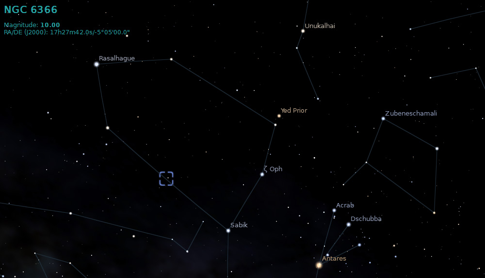 NGC 6366 is a relatively open globular cluster in the constellation of Ophiuchus. It is a distance of about 11,700 light years from Earth.