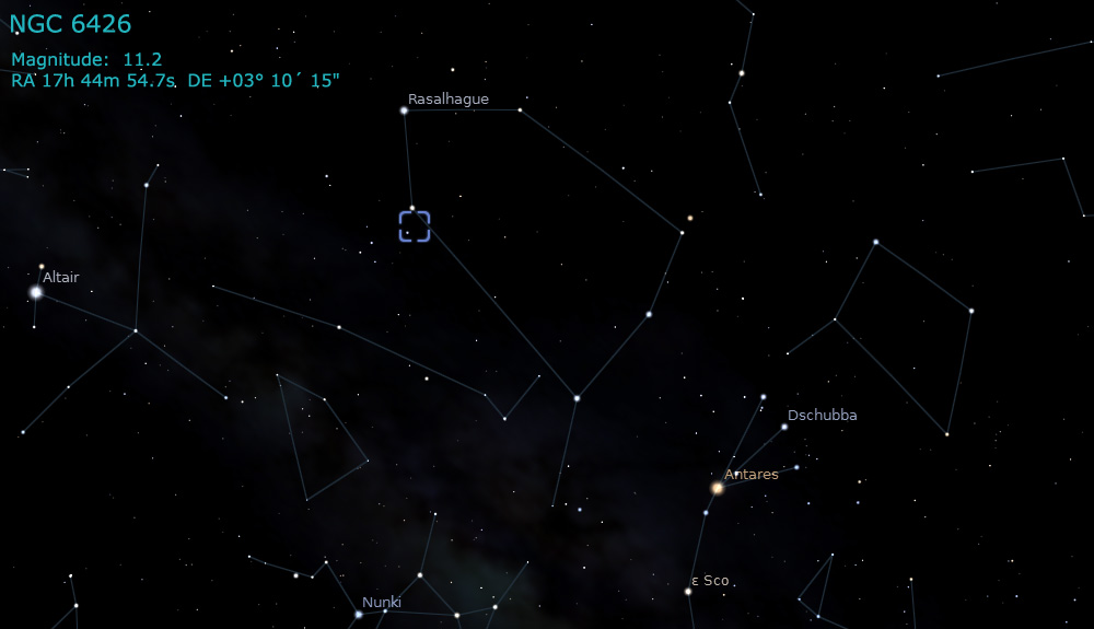 NGC 6426 is a globular cluster located approximately 67,000 light years away in the constellation of Ophichus. It has a visual magnitude of 10.9 and an angular diameter of 4.2'.
