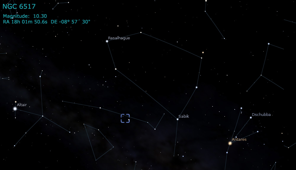 NGC 6517 is a globular cluster located an estimated 34,600 light-years away in the constellation of Ophiucus. It has an angular dia. of 4' with an apparent magnitude of 10.1.