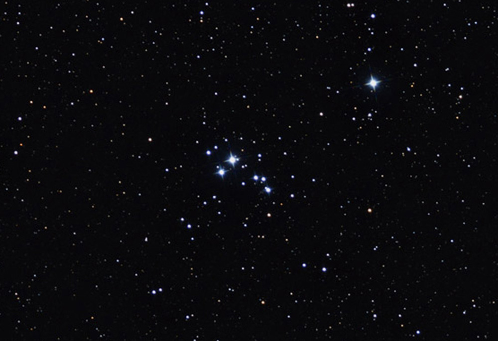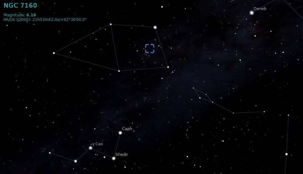 The small open cluster of NGC 7160 is positioned around center of Cepheus's pentagon. The cluster has an elongated shape in east west direction with a span of 7 arc minutes, and has about 20 member stars.